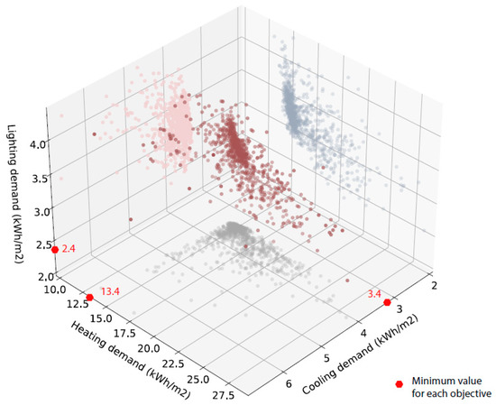 The optimisation with the multi-objective for minimising heating, cooling and lighting demands was run and is shown in this subsection. This optimisation aimed to illustrate how to apply the computational method developed in this study with multiple objectives and to compare it with the single-objective optimisations. In total, 1447 evaluations (1393 completed, 54 failed) were run, among which 925 designs satisfied the layout area constraint, i.e., the feasible designs. The total computational time used for the optimisation was 598 h and 46 min, around 25 days. All feasible designs of the optimisation are shown in a 3D chart with the heating demand (kWh/m2) as x axis, the cooling demand (kWh/m2) as y axis and the lighting demand (kWh/m2) as z axis in Figure 11.