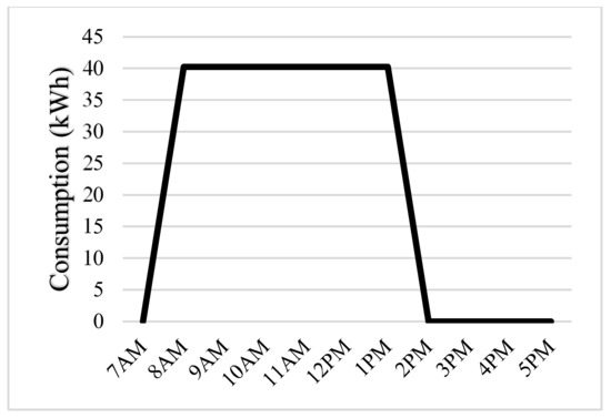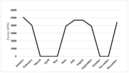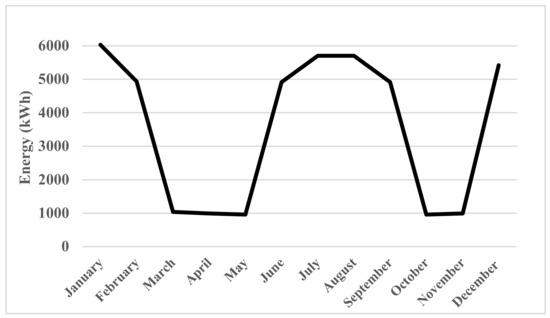In office buildings, the working routine is the same during weekdays, which means that the working conditions and occupants’ behavior that affect electricity consumption are constant. Nevertheless, to simplify the process, the standby electricity consumption of the small appliances is neglected. Importantly, for the purpose of creating the daily load profiles, two critical assumptions were made. First, the weather conditions were assumed to be the same over each month separately over the year to simplify the generation and thus, the sizing modeling. Second, the AC unit demand varies over the day depending on several variables including the ambient temperature; however, they are operated constantly in winter and summer months, but not the case in the spring and autumn seasons. The daytime loads in the sample building case study were classified as critical and non-critical loads. Critical loads are defined as loads that account for most of the building’s energy consumption; in this case, these are the air conditioning units (ACs). According to the building’s load classification, the months are also separated into critical and non-critical months based on the peak usage of critical loads. The consumption of critical loads is calculated by assuming that they operate from 5 to 6 hours daily depending on the month, excluding weekends, and that consumption varies between heating and cooling because heating consumes more energy than cooling. The breakdown of load energy consumption per month is shown in Table 2 and the critical load energy profile is depicted separately in Figure 5. The monthly consumption analysis is broad in scope and lacks specificity because it does not provide an accurate indication of the building’s behavior and energy consumption, necessitating a more accurate representation since there are some factors that should be taken into consideration. An hourly load profile provides the closest indicator of the building’s behavior. The hourly consumption is visualized in January and August as shown in Figure 6 and Figure 7, respectively. Generally, the critical loads are the ones with high-energy consumption with power demand profiles correlated with PV generation (during the day), while the non-critical loads are the small loads with continuous and semi-fixed power consumption behavior, such that their profile is predictable and does not present critical interaction with the grid.