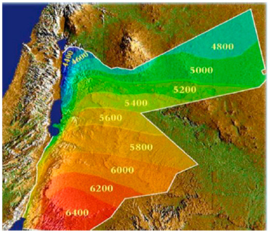 Jordan’s solar map (kWh/m2/day) [33].