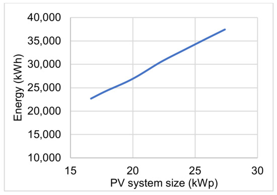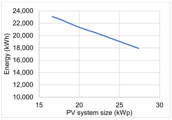 Table 5 shows that the size 16.65 kWp has the minimum losses and the maximum mismatch areas, while the size 27.38 has maximum losses and minimum mismatch areas, and this trend stays fixed for larger or smaller PV sizes as depicted in Figure 11 and Figure 12. Figure 11 shows the potential energy generation from the PV system, but without utilization from the load side due to seasonal behavior. The larger the PV system is, the more the wasted energy potential will be. Contrary to this, Figure 12 shows the energy requirements from the grid to support the load during times of PV power shortage, and apparently, as the designed system grows larger in size, less contribution from the grid is needed. Figure 13 shows the total system-defined energy losses against the designed PV system size. The total losses include data from both Figure 11 and Figure 12, cumulatively. Clearly, the figure shows multiple convexities that can be utilized for optimum design choice. Applying the optimization relation in (5) for the selection of the proper size and plotting the total system losses (areas A, B, and C) in Figure 13 shows that the optimum PV system size that satisfies (5) is .