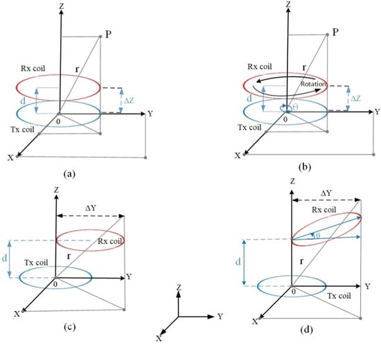 Schematics of circular coils for analyzed variations: (a) ideal alignment (vertical variation); (b) planar variation; (c) lateral misalignment; and (d) angular in lateral misalignment.