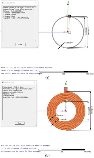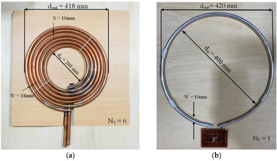 First, copper and aluminum loops of 420 mm (dout) were used to design one turn. The inner coil diameter (din) was 400 mm, and a line distance width of 10 mm was used. The receiver coils were mounted on the wooden pad for laboratory testing. A circle of dout = 418 mm and din = 260 mm was chosen to be identical to the asymptotic diameter of the transmitter coil. Then, a circular frame was constructed to design the transmitter coil and make the copper into a circular shape, as shown in Figure 5a. As mentioned previously, the circular shape promotes increased transfer efficiency by providing a more enclosed space (area) for a given distance (perimeter) than a square. The aluminum coil was chosen for the STLAC to ensure the lightweight of the receiver coil and maximum transfer power.
