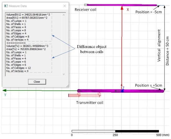 Figure 3 shows the HFSS simulator set up for the transmitter and receiver coils aligned to the z-axis test. Upon completing the drone’s mission, and landing on the platform, the FSR sensor will check the drone’s weight and the distance to the receiver coil to start charging the battery. The x-axis/vertical design approach first involves investigating drone charging in vertical alignment over several distances. In the simulation, seven transfer distances (2, 5, 10, 20, 30, 40, and 50 cm) of MRC-WPT were tested. The distance (X cm) with the best simulation results was then used in the misalignment simulation.