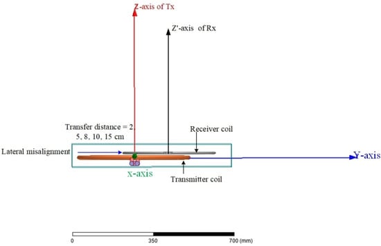 Some researchers have studied the problems of limited battery life, long charging times, short distances, precision requirements when smart devices use a transmitter pad with the axial alignment distance and lateral misalignment in different directions, and low transfer power efficiency for long distances. The coil dimensions are defined correctly when the axes of the z parameters of the coupled coils coincide at an axially aligned distance perfectly [14]. The rotation of the plane containing one coil from a pair of coupled coils without a change in the coil alignment results in planar rotation [15]. Range variations arise from changes in the distance between a pair of coupled coils. The vertical alignment could manifest in two forms: angular or lateral misalignment. These alterations in configuration may occur individually or could appear together at varying degrees in a coupled interaction between the transmitter and the receiver coils.