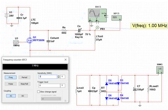 The implications standard of the present study in Class E PA switching was the use of constant envelope modulation techniques, such that the signal does not carry any amplitude information because of the assertive amplitude compression suffered in PA switching [49]. The transmitter and receiver coil matching network accounts for a great portion of the power loss. A great matching network design between PA and antenna coils is necessary. Therefore, all the power is delivered to the load. Various architectures are available for constructing a power amplifier that converts DC–DC voltage, such as Class E PAs [50]. The efficiency does not represent a physical parameter, it is only helpful for showing the requirements of the circuit for matching and stability. The advantage of Class E PAs is: (1) they have simple architecture and need only one active device; (2) their frequency range is wide KHz–MHz; and (3) they have high power transmission efficiencies. However, the disadvantage of Class E PAs is that any shift in resonance frequency will decrease the output power transmission appreciably. Figure 6 shows the matched resonance frequency obtained between the transmitter and receiver circuit using the Multisim software for electronic circuit design.