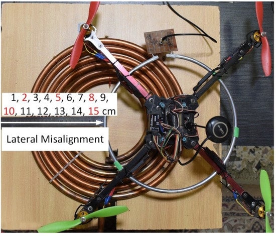 Secondly, a UAV or drone battery must often be charged for a long time. Therefore, highly efficient battery use during flight requires direct intervention from humans or the drone must be completely independent during direct charging [9]. However, wireless charging of the drone battery depends on the coil’s design diameter, outer and inner coil, and the number of turns to increase the transfer power efficiency and distance between the two coils. The imbalance in lateral misalignment distance between two coils while charging is a permanent electrical engineering problem that remains a challenge [10]. Therefore, this problem has prompted the need for continuous verification because the two coils are usually not perfectly aligned due to differences in the coupling factors and the wrong hovering position of the drone. Moreover, these differences can decrease the transfer distance and power transfer efficiency of the receiving coil, causing fluctuations during the charging process [11]. Therefore, improving the energy transfer efficiency and transfer distance in several directions is crucial to achieve energy transmission with high efficiency. Generally, to alleviate this problem, the diameter of the primary winding must be greater than the diameter of the secondary winding and equal to twice the distance between the two windings [12], or a group of several fixed primary windings must be used to charge a single winding [13].