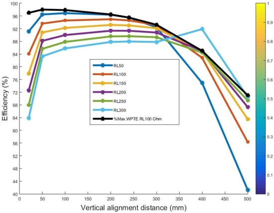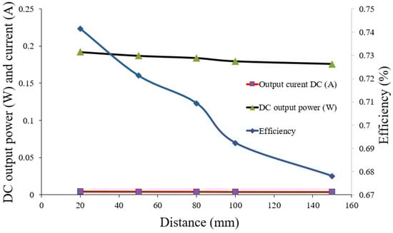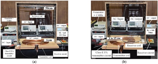 - First Experiment: This experiment was for a vertical alignment system with a 100 Ω load. In vertical alignment, air gap/transfer distance measurements of 2 to 50 cm were considered. The MTSCC was tested with the second coil consisting of a one-tap (i.e., an STLAC with one turn). The number of turns was selected based on the first and second simulations, wherein a tradeoff between coil weight, transfer power, and efficiency was achieved to obtain an acceptable transfer performance and weight. Figure 8a shows an example of the vertical alignment improvement in transfer distance between 2 cm to 50 cm when RL = 100 Ω.