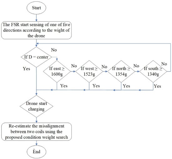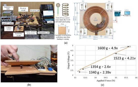 To detect the drone landing in the experiment, a four FSR sensor configuration, which was adapted from [29,38,55] was set up on the squared platform (Figure 9a). The sensors were installed at the edges of the platform using a small spiral spring and 20 × 20 cm2 of wood (Figure 9b). The wood’s weight will be increased when a drone lands. An Arduino UNO and the four FSRs (i.e., Dy1, Dy2, Dx1, and Dx2) were connected to the platform station to start charging when the drone lands. The Arduino functions to read the signal from the FSR, convert the signal to the equivalent weight, and finally reduce the power consumption using the sleep/wakeup strategy. In addition, the regulator and relay circuit required for each voltage, which depends on the drone’s weight, can sense the FSR that is needed to charge the drone.