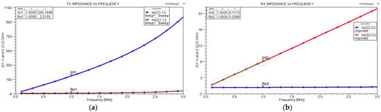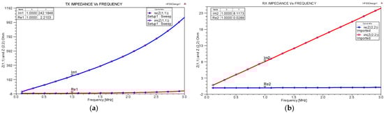 Re (Z1,1), Re (Z2,2), Im (Z1,1), and Im (Z2,2) represent the real and imaginary parts of the Z-parameters of both the transmitter and receiver. The quality factors of the transmitter (Q1) and receiver (Q2) coils are calculated from Equations (2) and (3) [37]: