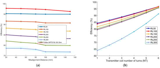 The overall power transmission efficiency between the transmitter and receiver is often denoted by the transfer efficiency link (ηlink), which will be investigated throughout the rest of this paper. Based on the ηlink optimum load resistance level chosen according to Equation (9) [14], the load quality factor (QL) of the WPT system in simulation can be obtained from the following equation: