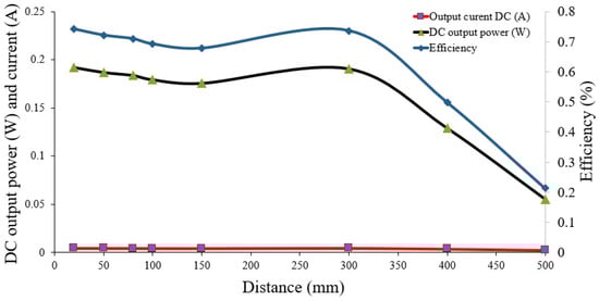 This work achieved the reduction of the misalignment problem from the lateral configuration by adopting a large primary and secondary coil configuration. The receiver coil was configured as an STLAC with one turn and was employed alongside the receiver circuit with the transmitter coil (i.e., MTSCC). Five different misalignment distance values were selected as 2, 5, 8, 10, and 15 cm (Figure 7: red color), and other distances were almost the same value at 2 cm of the vertical distance between receiver and transmitter coil, which were experimentally tested to evaluate the energy transfer performance. The pad of the base station was implemented to ensure a lateral misalignment of not more than 15 cm between the transmitter and the receiver coils, as shown in Figure 7. The transfer power and efficiency were measured for these distances during drone landing. The direct current (DC) and voltage were measured with 2 cm of air gap fixed in vertical alignment. However, the DC output power and transfer efficiency were calculated when the drone’s battery loaded the receiving circuit.