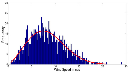 The Weibull PDF shaping and scaling factors are β ,   α ; these were set at 9.4 and 2.4, respectively. Figure 1 shows a 1000 Monte Carlo wind speed distribution scenario using Weibull PDF.