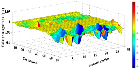 • In the IEEE 69-bus, through the optimal integration of RDGs, the expected total cost, emissions, summation of voltage deviations, and voltage stability index were reduced by 28.3%, 52.34%, and 66.95%, respectively, and the stability of the system was enhanced by 5.6%, compared to the base case.