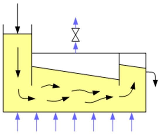 Sketch of the sandTES fluidized bed heat exchanger. Black arrows represent the flow of sand (yellow), while blue arrows show the fluidization air flow. The valve at the top is used to create a pressure zone (so-called air cushion) to control the sand level below. Both sand and fluidization gas are external flows.