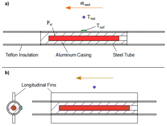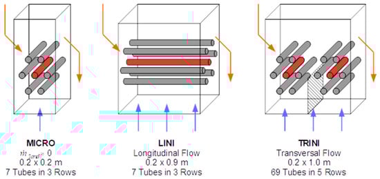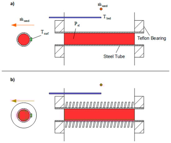The LINI test rig has a similar configuration, but with significant longitudinal sand mass flow. Additionally, longitudinal fins were investigated. A sketch of the setups is shown in Figure 5.