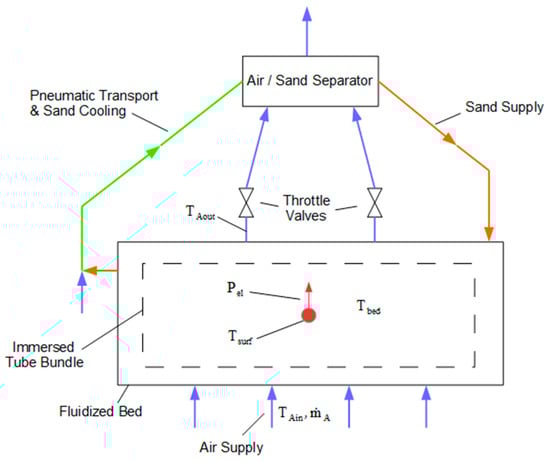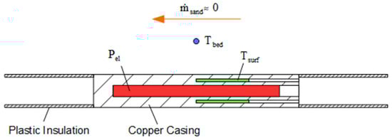 The entire electric power (heat) was assumed to be transferred into the fluidized bed (sand and fluidization air), so all heat losses were ignored. This is justified by thermal insulation of the heated pipes, as described in Section 2.1, and additional thermal insulation of the fluidized bed casing.