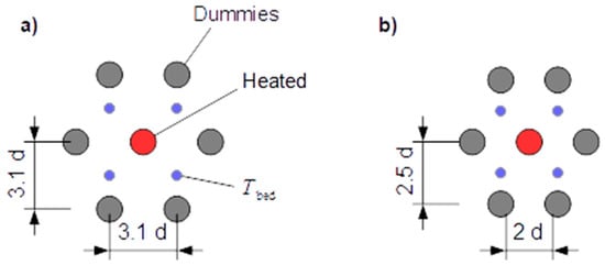 All heated tubes were placed between unheated tubes (dummies) to create a tube bundle with similar flow conditions as in an actual fluidized bed heat exchanger. Two different tube spacings were used (see Figure 7).