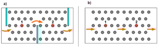 TRINI flow configurations: (a) With and (b) Without baffles. Both heating tubes (red, numbered 1 and 2) are active at the same time.