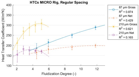 The heat losses appear to be greater than with the regular tube spacing, in particular when using 210 µm sand, where the heat losses are disproportionate and the net HTC decreases steadily. The net HTC of the 87 µm sand seems to decrease faster than with the regular tube spacing shown in Figure 9 and has a maximum value at a lower degree of fluidization.