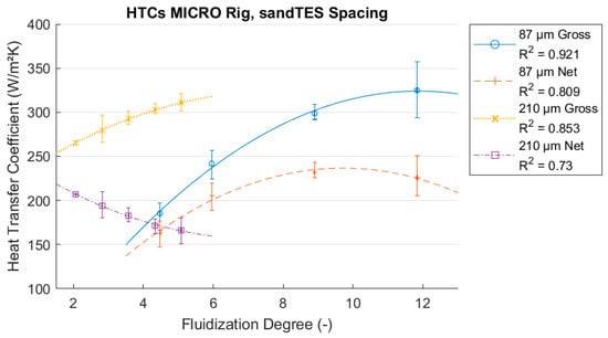 Both figures show that at lower degrees of fluidization, where a fluidized bed would usually be operated, the coarser sand seems to perform better than the finer sand in terms of achievable HTC. As mentioned in Section 2.2, in an energy storage application with recuperated (hot) fluidization gas, the net HTC is expected to be closer to the gross HTC. However, larger particle diameters greatly increase the power required for fluidization, lowering the efficiency of an energy storage system. This auxiliary power is proportional to the minimum fluidization velocity (which is proportional to the particle diameter) and the degree of fluidization. The greater required air mass flow for fluidization is also represented by the greater difference between gross and net HTC of the 210 µm sand compared to the 87 µm sand, which results from greater heat losses. Therefore, a compromise was made and sand with a mean particle diameter of 146 µm was used in all experiments from this point on.