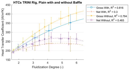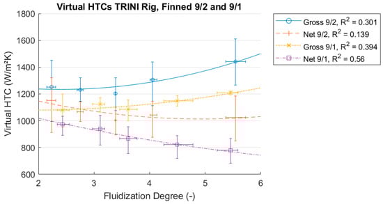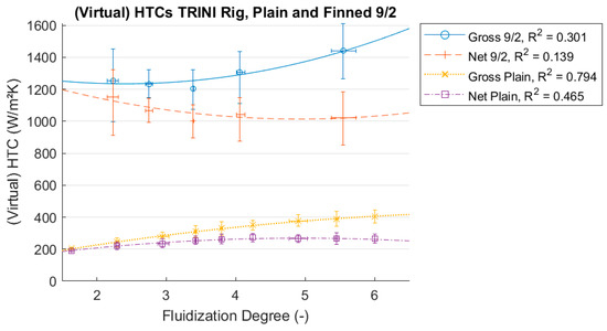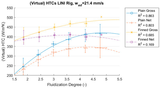One can see that the finned tubes perform better than the plain tubes, especially at lower degrees of fluidization. The difference between gross and net HTCs is slightly increased in the case of the finned tubes compared to plain tubes, which is likely due to the larger total heat transfer area. However, the finned tubes were unable to increase maximum performance significantly.