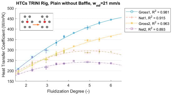 However, to help the reader to interpret the results, regression curves are introduced in all graphs. The underlying hypothesis of all experiments is that the heat transfer coefficient would at first increase with the degree of fluidization, experience a maximum value, and then decrease again. For this reason, a second order polynomial was fitted to all results using the method of least squares. The values of R2 (the coefficient of determination) given in the figure legends then indicate how well the respective data fits the hypothesis.