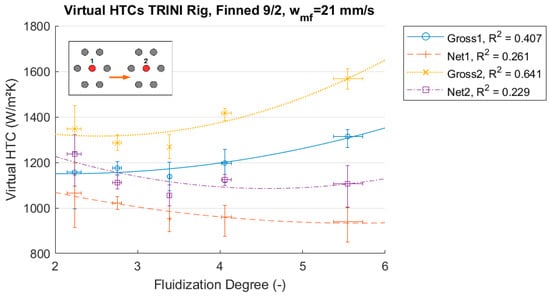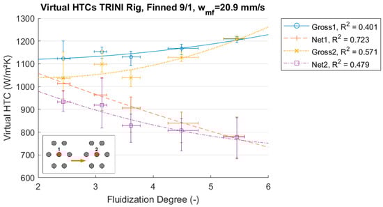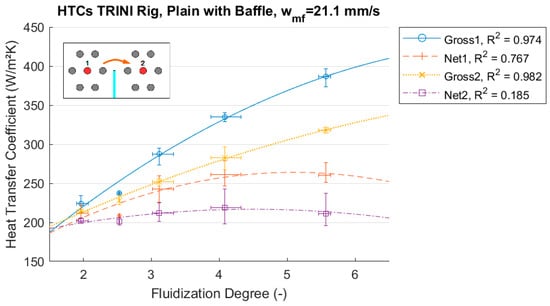 The net HTC takes the heat losses caused by the fluidization gas into account: