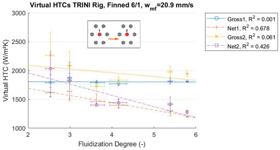Two types of HTCs were measured, which are called gross and net HTC. The gross HTC is directly derived from the definition of the HTC to the surrounding fluidized bed:
