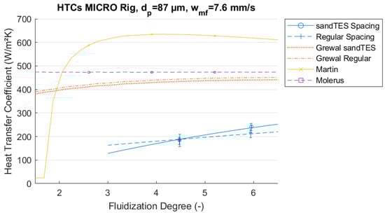 While Molerus is close to Grewals’s predictions in the case of the 87 µm particles, it is very far away in the case of 210 µm particles. This demonstrates the great discrepancies between correlations often encountered when trying to predict heat transfer in a fluidized bed.