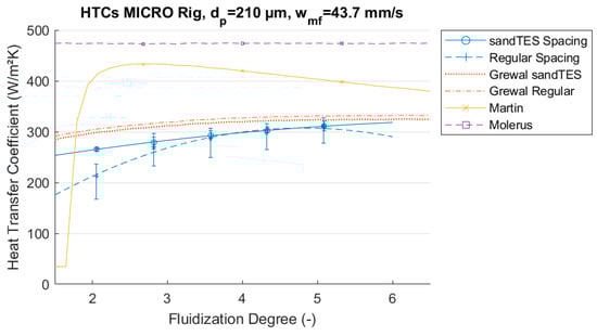 Martin overestimates the minimum fluidization velocity in the case of the 210 µm particles, resulting in a sharp increase in predicted heat transfer coefficients only at a degree of fluidization of about 1.5. This is caused by the correlation for the estimation of the bed porosity that predicts porosities lower than the (measured) 45% at very low fluidization. To ensure a consistent use of the porosity correlation across all HTC correlations, bed porosity in Martin’s correlation was kept at a minimum of 45% to overcome numerical issues. See the methodology report in the repository for details.