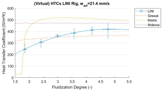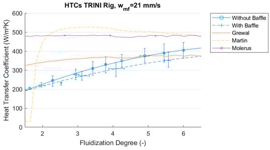 The independent variable for the following graphs, showing the HTC-measurement results of all experiments, was the degree of fluidization, which is defined as the superficial fluidization gas velocity divided by the minimum fluidization velocity (). Using the fluidization degree FD rather than the actual superficial velocity allowed a better characterization and comparison of the fluidization mode. Superficial velocities can always be obtained by simple multiplication of with FD.