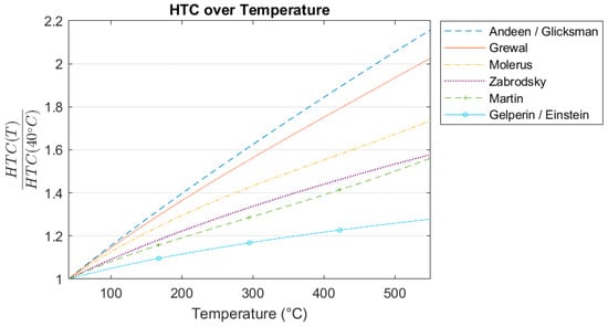 In the experimental work of this paper, the differences in particle convective heat transfer for different geometries and particle flow arrangements at temperatures slightly above ambient temperature (40 °C) was determined. In order to estimate the temperature dependence of the HTC, several of the aforementioned correlations were investigated in respect to their sensitivity to temperature changes, namely the ones by Andeen and Glicksman [2], Grewal [4], Molerus [5], Zabrodsky [20], Martin [7], and Gelperin and Einstein [21]. Unfortunately, there are great discrepancies between the predictions, as shown in Figure 25.