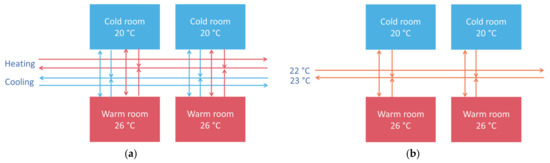 - Maccarini, A.; Wetter, M.; Afshari, A.; Hultmark, G.; Bergsøe, N.C.; Vorre, A. Energy saving potential of a two-pipe system for simultaneous heating and cooling of office buildings. Energy Build. 2017, 134, 234–247. [Google Scholar] [CrossRef] [Green Version]