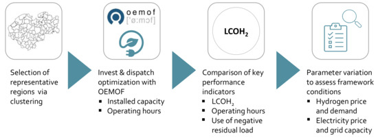 The research question was then answered in the next three steps (Figure 2) by modelling the different decentralized energy systems at different points in time (status quo and 2050 scenario) and by a criteria-based (key performance indicators) comparison of the regions. The open-source framework OEMOF was used for the modeling [41]. We referred to levelized cost of H2 (LCOH2) to assess the potential profitability of the regional PTG system. Together with the operations hours and the use of local negative residual load, this was used as an indicator for the operation mode. The impact of the regulatory, market and technical framework was determined by varying the corresponding input parameters. The results provide information on the influence of specific measures discussed in the literature.