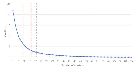 Figure 5 shows the solution space for the choice of the number of clusters. Using the elbow criteria, the number of clusters is between five and eleven (red lines in Figure 5). According to the test of Mojena, the optimal number of clusters is 15 (black line in Figure 5).