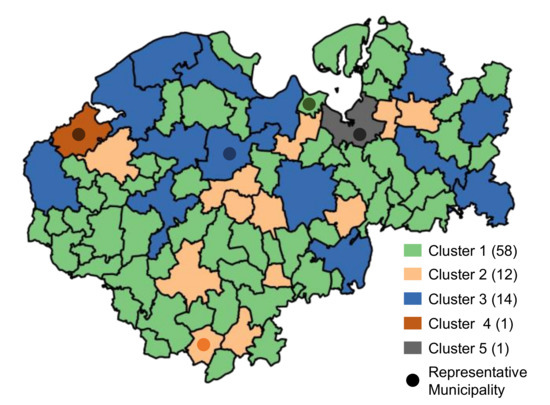 However, it is also important that the differences between the final clusters can be described verbally. After further analyses of the data and the different numbers of clusters, the five-cluster solution was selected for the following analysis. It should be noted that the selected municipality-level spatial resolution is of a higher level of differentiation than in comparable cluster analyses [47]. Figure 6 shows the municipalities in NWM, with different colors representing the clusters of the five-cluster solution.