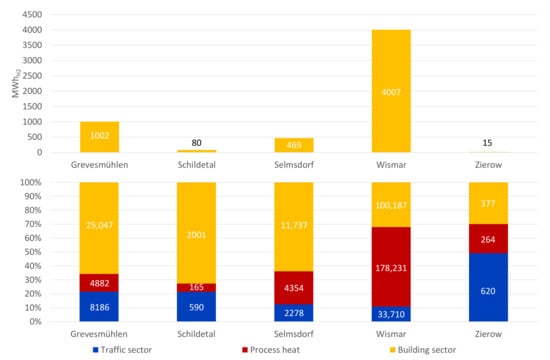 The regional expansion of electricity generation based on renewable energies causes a change in the regional energy balance. Regions with high installed renewable-energy (RE) generation capacity have energy quantities that exceed their local energy demand. In Germany, for example, this is the case in regions with high wind-energy potential in the north. The German federal state of Mecklenburg-Vorpommern (MV) in the northeast had the highest share of RE in gross electricity consumption of 147% among the German states in 2016 [26]. Due to the volatile feed-in, there are deviations between RE supply and energy demand during the year, with the extent of these differences varying from region to region. As one consequence, the resulting operating mode for electrolyzers may differ between an urban region and a rural region. In addition to the difference in demand quantity and structure, the installed RE power capacity and generation in each region must also be considered [27].