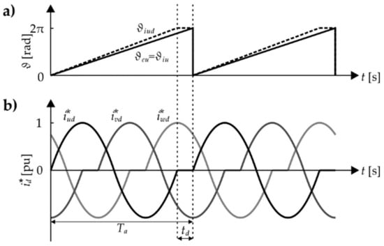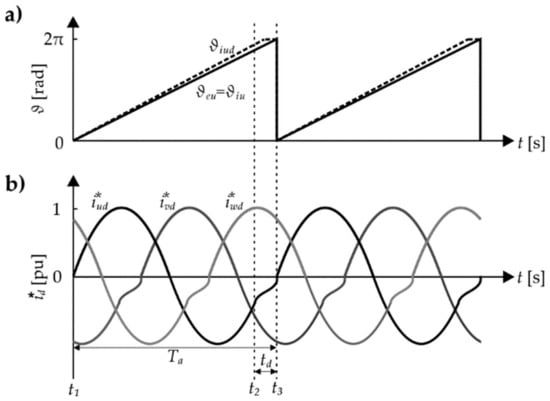 The auxiliary angles ϑiud,vd,wd used to generate the set signals of the distorted grid currents i1ud,vd,wd in the discrete form were calculated using Equation (6) for each of the phases, respectively.