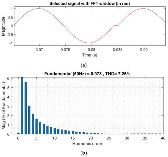 Therefore, an improvement of the detection of the islanding mode in the AFD method can be made. The amount of active energy transferred in detection standby mode can be increased. In addition, it is possible to keep the detection time short and improve the spectrum of the generated current. The authors developed an improved AFD method, which introduces a new type of disturbance to the sinusoidal waveform of the converter current signal. The distorted current signal waveform in the standard AFD method can be divided in the time domain into two parts. The first part contains a sinusoidal waveform with a slightly higher frequency than the network’s nominal frequency. As a result, during one period of the mains voltage, the set signal of the mains current of the converter reaches the end of its period slightly earlier than the mains voltage (Figure 4b). The second part of the current waveform is when it goes to zero at the end of its period and is held at zero until the line voltage becomes zero. The proposed method novelty replaces the period when the set current maintains the value zero with the course of the hyperbolic sine function. The article contains a detailed description of the implementation of the proposed solution. The authors present the results of laboratory and simulation tests. The newly proposed type (shape) of the introduced disturbance improves the THD40 coefficient while maintaining the same time of the introduced disturbance. The THD40 is defined as the root mean square value of the first 40 harmonics of the signal, divided by the RMS value of its fundamental signal [].