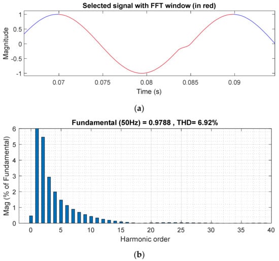 The result of the simulation of the AFDhs method (facc = 2, x = 2): (a) waveforms of the set converter current signal on the AC side, (b) harmonic analysis of the waveform shown in (a).