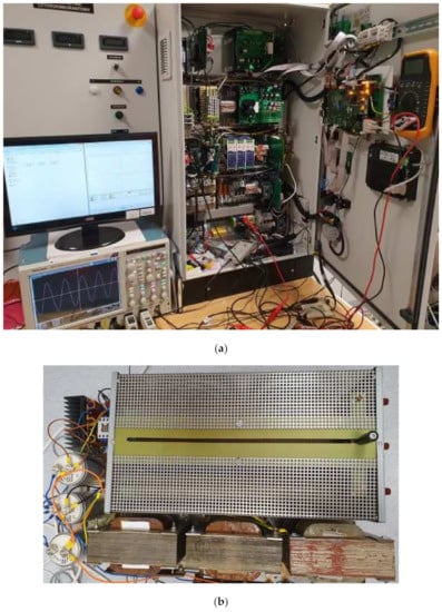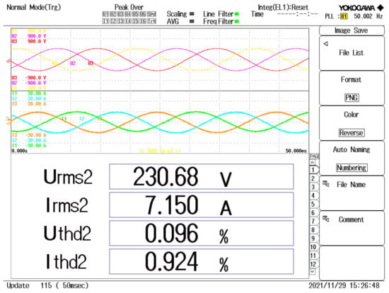 Subsequently, laboratory tests were performed. The control algorithm was created in C++ and loaded into microprocessor Analog Devices ADSP-21369. The microprocessor is supposed to gather all signals from the voltage and current transducers, and compute the duty cycles for each phase. The generation of gate pulses for the transistors in a two-level AC/DC converter was executed in Spartan XC3S400 FPGA. The tested system (Figure 8) was powered by an arbitrary power source California MX30-3Pi. The presented time courses were recorded on Tektronix DPO7054C oscilloscope and Yokogawa WT1800 power analyser. A set of photos showing the components of the laboratory circuit is presented below.