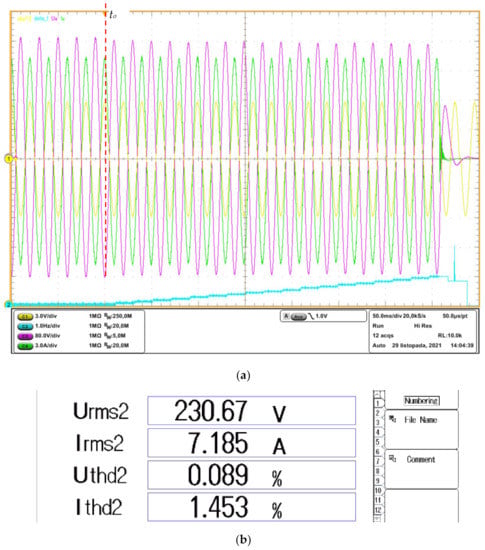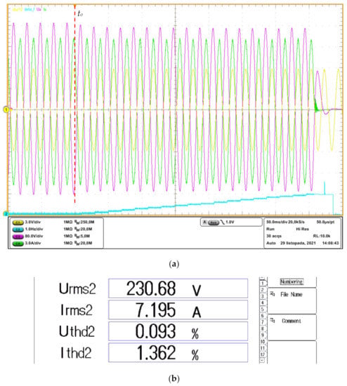 Island operation state detection by the AFDhs method (sco = 1, dco = 2, x = 2.5): (a) waveforms of the grid voltage (magenta), grid current (green), 0.5*reference grid current (yellow) and frequency delta fa-frtd (blue). (b) The network voltage and current THD40 values measured by the power analyzer in normal operation (grid-connected).