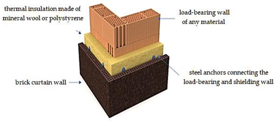 In an energy-efficient building, the proper design and construction of all external partitions has a fundamental influence on obtaining the proper thermal comfort of rooms [16,17]. The energy efficiency of a house is determined, among other things, by the heat transfer coefficient of each of its elements, such as the floor on the ground, walls, roof, windows, and doors. The lower the value of the heat transfer coefficient, the better the insulation properties the partition exhibits. According to the currently binding construction law, the heat transfer coefficient (U) cannot exceed 0.3 W/(m2·K) in the case of floors on the ground and ceilings above unheated cellars; 0.2 W/(m2·K) for external walls; 0.15 W/(m2·K) for roofs, flat roofs, and ceilings under unheated attics. The U value of the entire partition depends on the lambda thermal conductivity coefficient (λ) and the thickness of all its layers. The lower the value of this coefficient, the better the thermal insulation of the external partition by specific thickness. In construction, thermal insulation materials should be used that have λ within 0.03–0.05 W/(m·K) [18,19,20]. Walls are one of the most important elements of a home. They are exposed to unfavorable weather conditions such as rain, snow, wind, frost, and UV rays [21]. Therefore, they must be durable and, at the same time, provide good thermal insulation, tightness and soundproofing, be non-absorbent, and resistant to frost and color fading caused by the action of the sun [22,23,24,25]. Single-layer walls in an energy-saving house are rarely planned, although there are technologies that allow them to achieve the required thermal parameters, there are often construction problems that result in the lack of proper airtightness of partitions and the formation of thermal bridges. Three-layer walls (Figure 1) are the best type of partitions that ensure durability, tightness, thermal accumulation, and very good acoustic insulation of the house [26,27].
