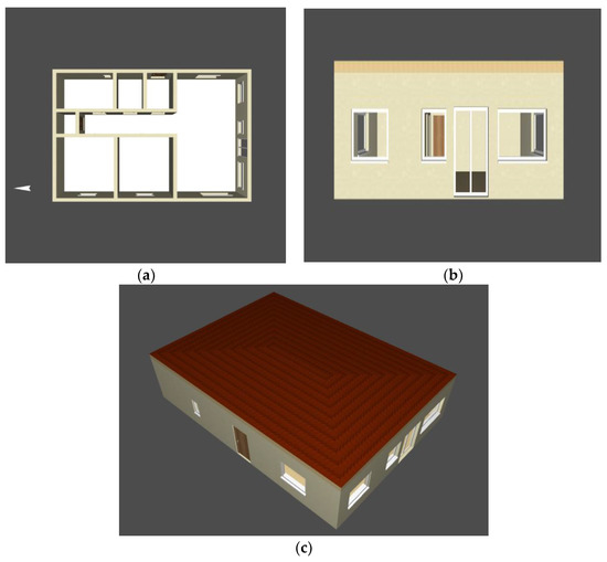 Analyzed building. (a) Building plan in 3D; (b) southern facade of the building; (c) 3D top view of the object. Source: own study.