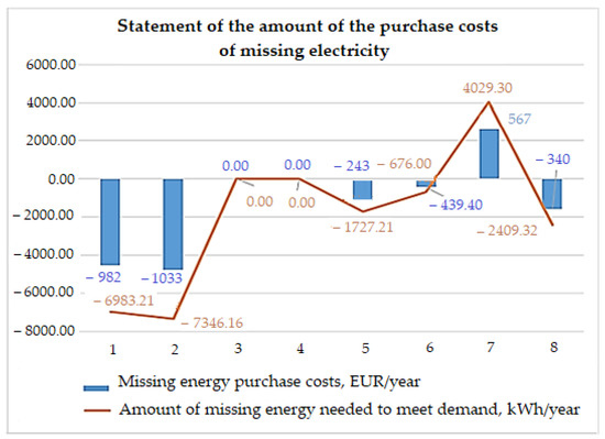 Table 17 shows the total purchase costs of the analyzed solutions. On the other hand, Figure 3 presents a summary of the quantity and costs of purchasing the missing electricity during the year.