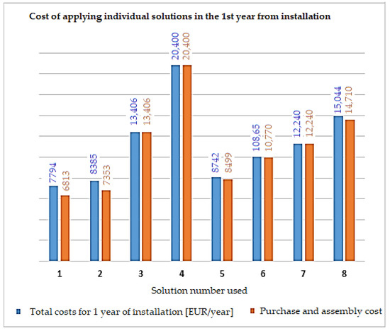 Figure 4 shows the amount of electricity that was insufficient to meet the needs of the analyzed building and the costs that must be incurred for this purpose. Ensuring the independence of the house from the power grid means that the selected solution will cover the household’s demand for electricity necessary to power household appliances, lighting rooms, central heating, and hot water. The largest amount of electricity must be additionally purchased in the case of using a ground heat pump (7346.16 kWh/year; 1028.47 EUR/year). Similar values were observed for the installation of the air heat pump (6983.21 kWh/year; 977.65 EUR/year). The use of an air heat pump in the building in conjunction with a photovoltaic installation and an induction boiler in conjunction with a photovoltaic installation ensured that the total electricity demand was met and there was no need to purchase additional energy. There was also no overproduction of energy. Using a heat pump air-water in combination with a wind turbine with a vertical or horizontal axis of rotation, one should take into account the necessity to pay EUR 87–260 per year for the missing amount of electricity. A 2.2-kW horizontal swing turbine generates 20% less energy compared to a 2-kW vertical rotation turbine. This translates into almost EUR 152 higher costs of purchasing the missing energy. However, when using an induction boiler in combination with a wind turbine with a horizontal axis of rotation, after ensuring the self-sufficiency of the building from electricity, there was an overproduction of 4023.30 kWh/year. Additional energy can be used to power other devices that, for example, will appear on the farm after some time and have not been included in the demand. Then, you can save EUR 565.72 per year at the electricity price of EUR 0.14/kWh. Then, the research compared the total expenses that must be incurred in the first 12 months from the installation and purchase of a new one energy sources. These costs are shown in Figure 5.