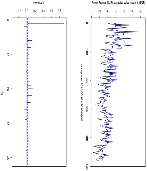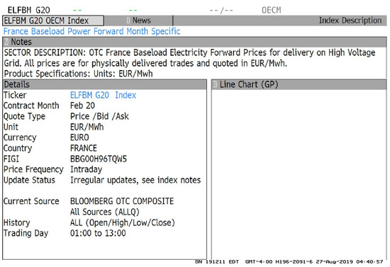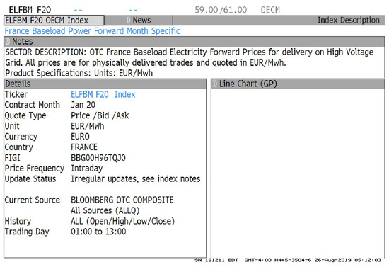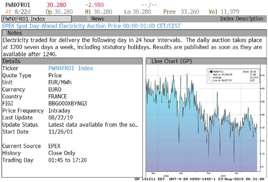 We calibrated the SMaPS model with data from the European Energy Exchange EEX (https://www.eex.com/en/, accessed on 23 August 2019) regarding the wholesale electricity market in France. The EEX spot market is a “day-ahead market” where hourly power contracts for the 24 h of the following day are traded. We obtained the hourly time series of the European Power Exchange (EPEX) spot market day-ahead electricity auction prices for France (ticker Bloomberg: PWNXFR XX, where instead of XX the delivery time of electricity for the following day must be selected), with technical specifications as shown in Figure 1.