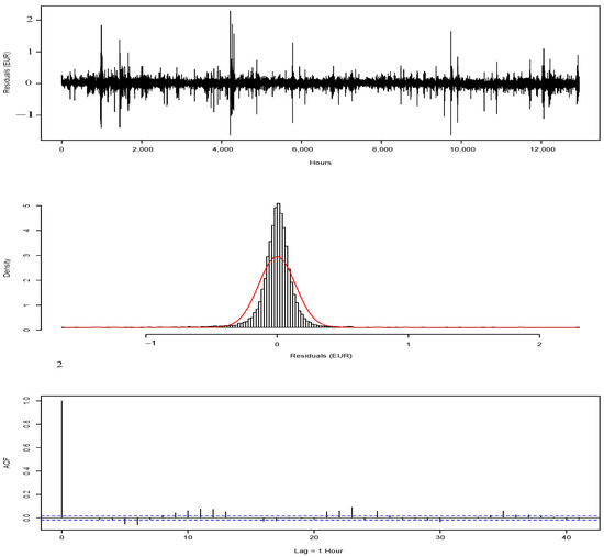 Next, a normality test was performed on the estimated residuals of the SARIMA model. The distance between the empirical distribution of the data and the benchmark distribution was estimated using the Kolmogorov–Smirnov test or Kolmogorov distance. In this case, the hypothesized continuous cumulative distribution function is the normal distribution with mean zero and variance . The normality hypothesis is rejected because the p-value is 0, indicating the rejection of the null hypothesis that residuals are drawn from the normal distribution. Moreover, looking at the middle plot in Figure 4, a leptokurtic empirical distribution of is observed.