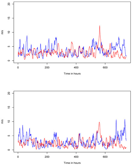 To obtain a numerical estimation of Equation (32), the wind speed scenarios are generated again by applying a shift on the trajectories of the wind models previously used. Next, the Monte Carlo estimations for are given as