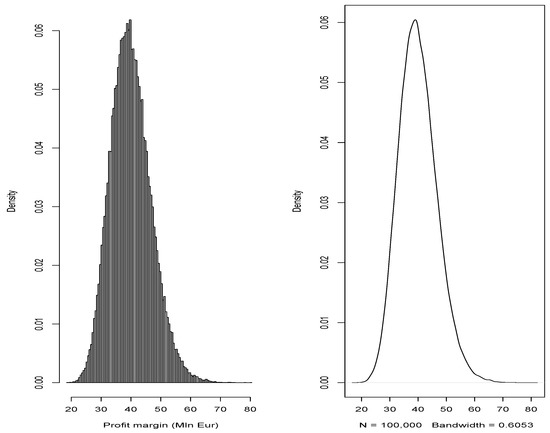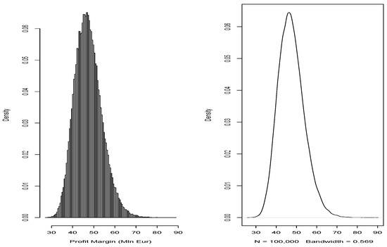 At this point, retracing the steps mentioned in Section 4.1, we estimate the probability distribution of and recalculate all its respective risk measures. The hedging strategy implemented implies that the new worst-case value appears to be EUR 29,306,880, with an improvement of compared to the portfolio’s EUR 20,609,424 without the two structured financial instruments. Similarly, the overall EaR of the portfolio is now valued at EUR 18,137,476, with a reduction compared to the previous EaR without the two structured contracts. This phenomenon is justified through the high electric price volatility, compared to the many variables now common in the literature that contribute to the peculiar variance of the hourly price of electricity.